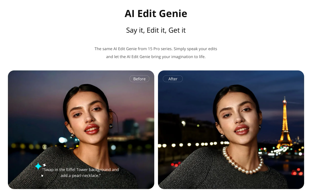 You can use voice or text to input image editing commands, and AI Edit Genie will automatically execute them for you.
