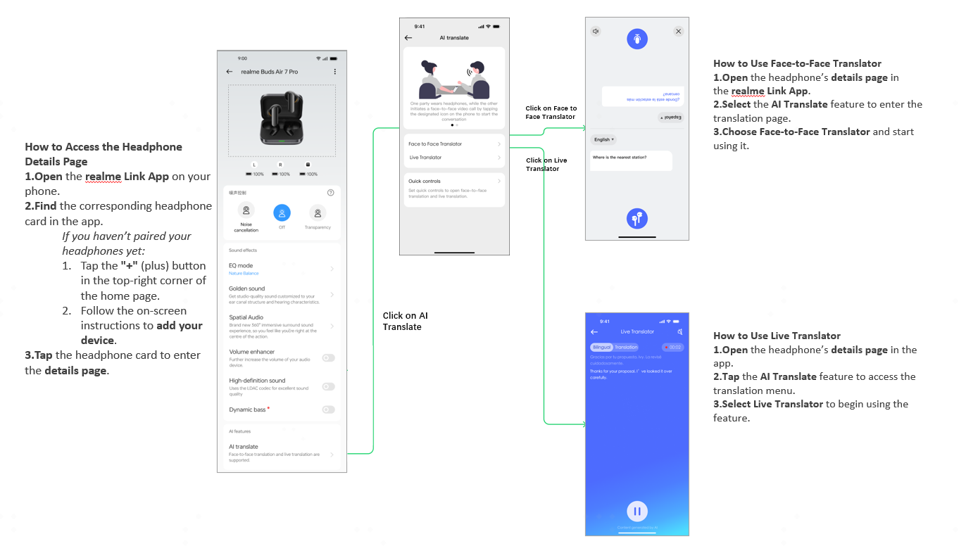 AI Live Translator: Translates speech in one direction (e.g., a lecture). The translated audio plays through the earbuds (ideal for monologue scenarios).