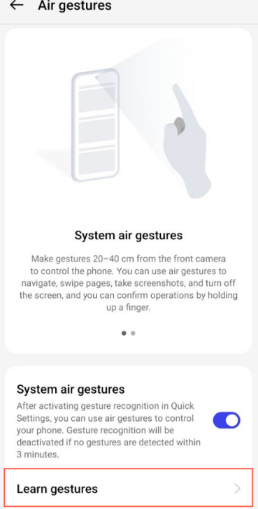 3. Please note that the gesture should be performed 20-40cm in front of the front camera to ensure that the front camera can capture your gestures.