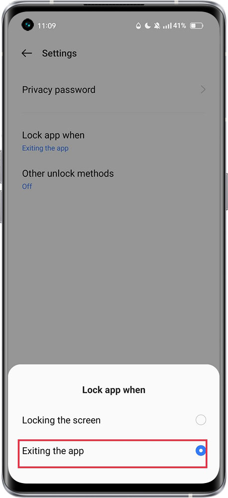 realme UI 5.0 & 4.0 & 3.0: Settings > Search "App lock" in the search bar > App Lock > Click setting icon on the top right-Settings > Lock app when > Select Exiting the app.