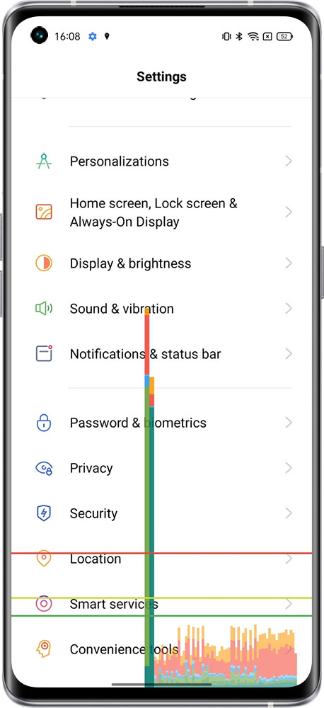 This phenomenon occurs if the Profile GPU Rendering is turned on by mistake. Please find and click Profile GPU Rendering in Developer Options, and select Close.