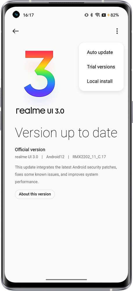 realme UI 3.0 & above versions & U Edition: Settings > About device > Click up to date / realme UI > Click the settings button in the upper right corner > Enable or disable Auto update overnight