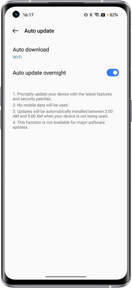 realme R & Go & T & S Edition: Settings > System > System / Software update > Settings > Enable or disable Auto update overnight