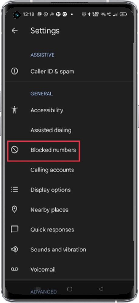 Path: Open the Phone app Tap More options > Settings > Blocked numbers > Add a Phone number > Type the contact detail to block