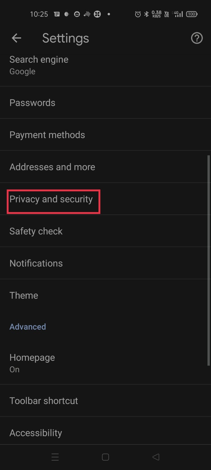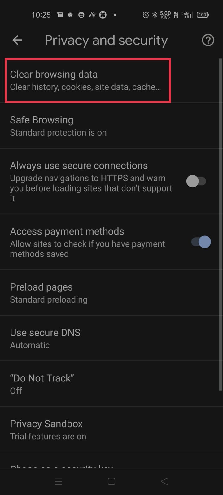 Step 1: Click on Chrome > Click on the Three Dots at the right top side > Settings > Privacy & Security > Clear Browsing Data.