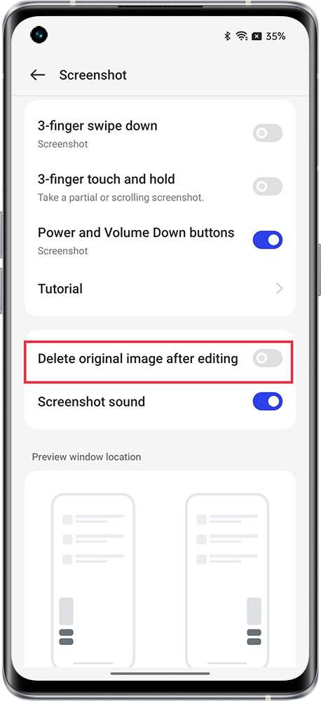 realme UI 3.0 & above versions: Settings > Search "Screenshot" in the settings > turn on Delete original image after editing
