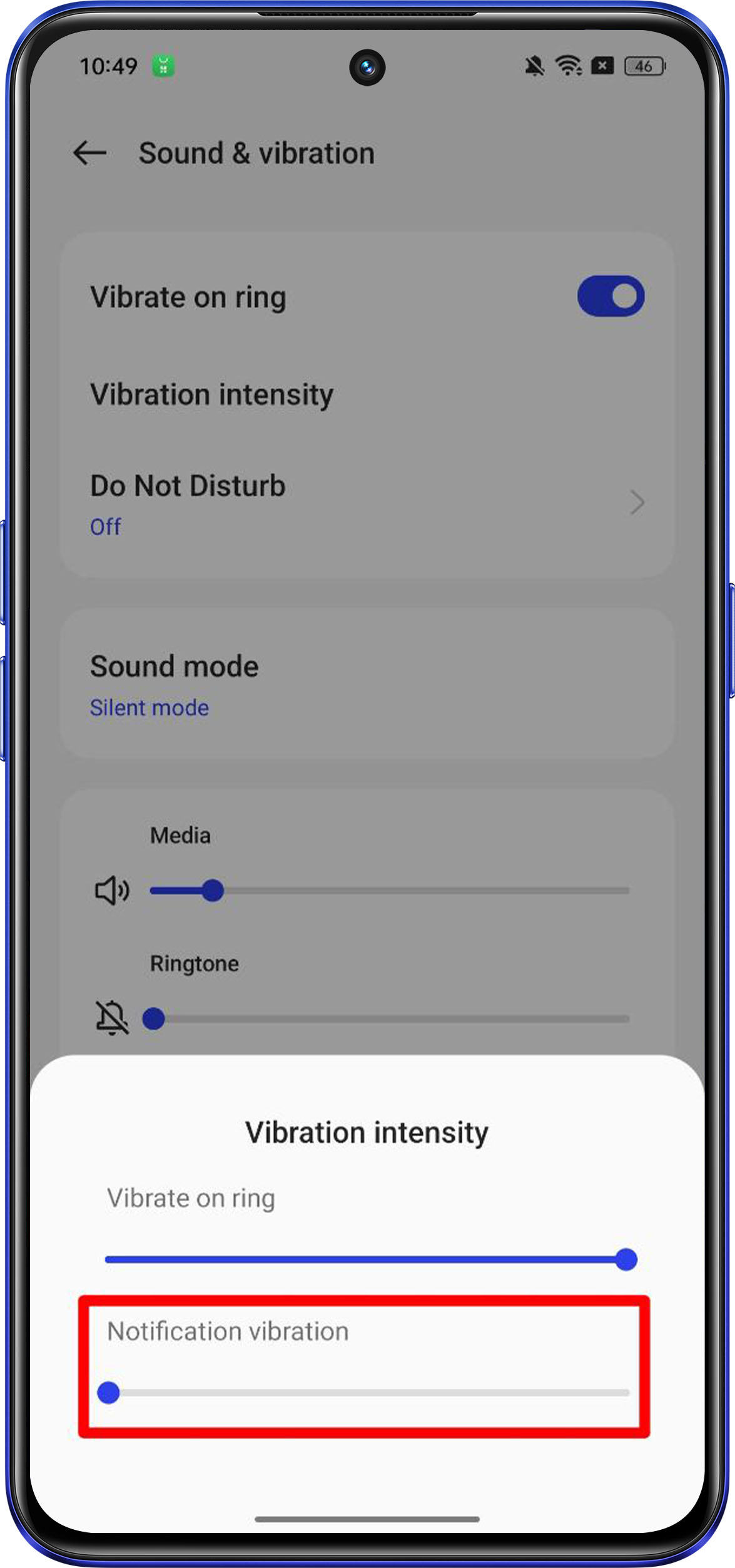 realme UI 3.0 & above versions: Settings > Sound & vibration > Vibration intensity > Turn off the Notification vibration