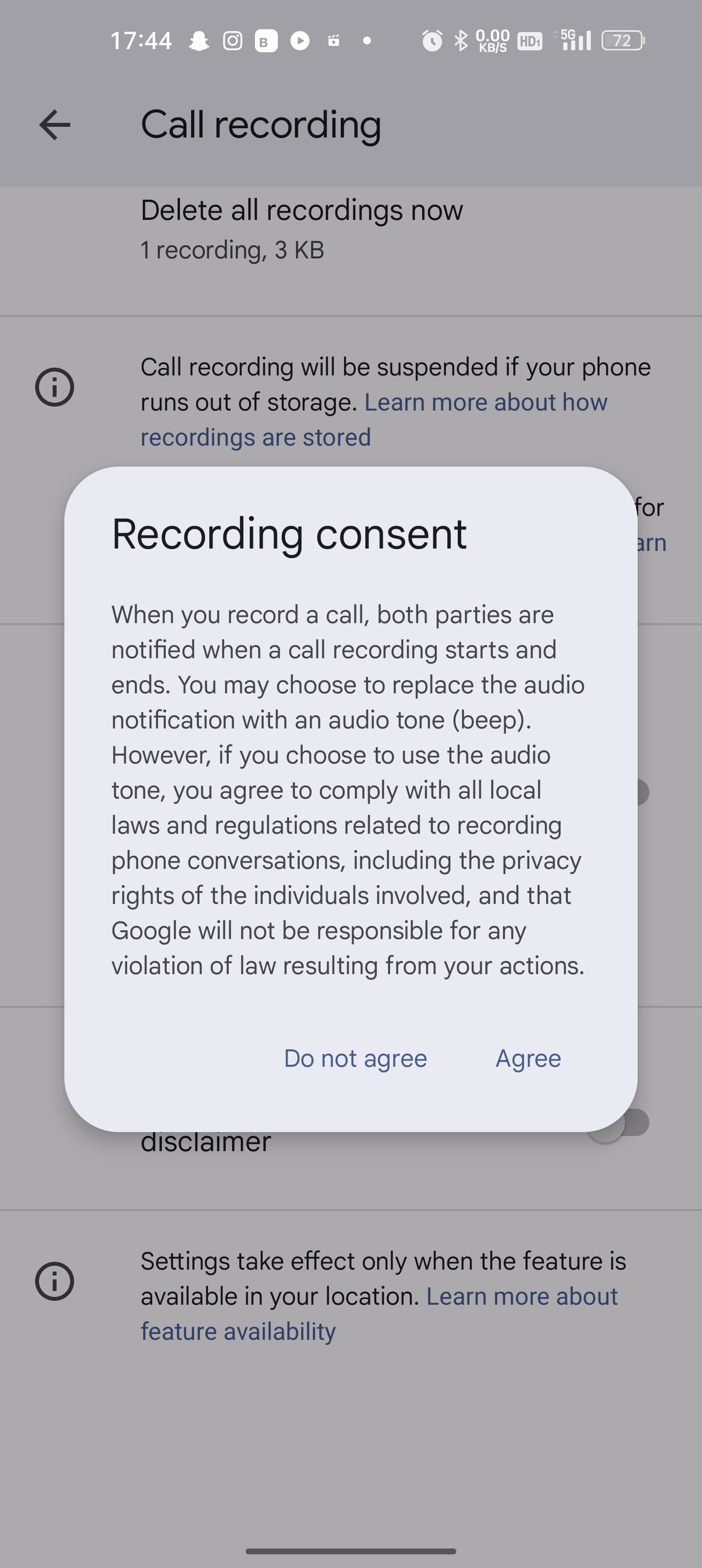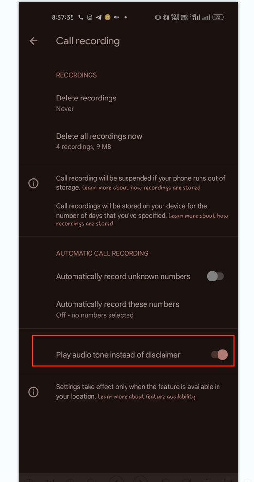 But you can turn on the Play audio tone instead of the disclaimer and replace the audio notification with an audio tone (beep). However, if you choose to use the audio tone, you agree to comply with all laws and requirements related to recording phone conversations, including the privacy rights of the individuals involved, and that Google will not be responsible for any violation of law resulting from your actions.