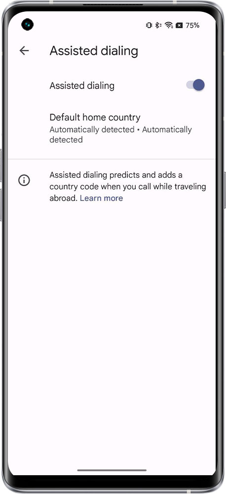 Open the Phone app Tap More options  > Setting > Assisted Dialing > Turn assisted dialing on or off.