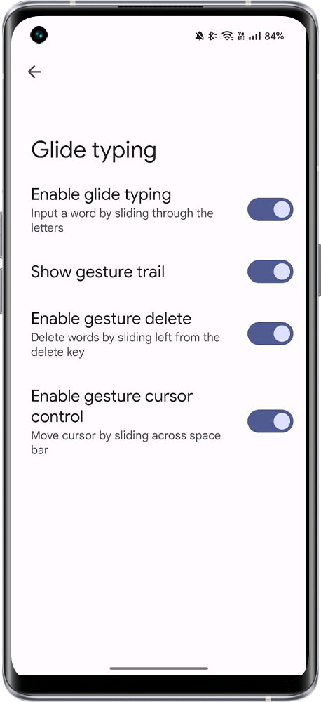 realme UI R & Go & S & T & U Edition: Settings > System > Language & input/Keyboard > On-screen keyboard > Gboard > Glide typing