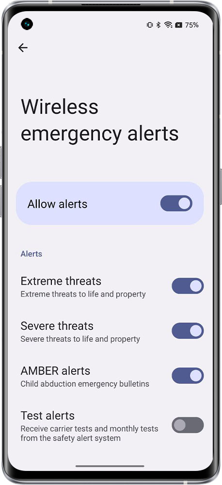 realme UI T & U Edition: Settings > Safety & emergency > Wireless emergency alerts.