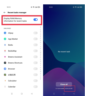 View method: Go to [ Settings > Additional settings > Recent tasks manager > Open "Display RAM/Memory information for recent tasks"; open the recent task management interface, and dynamic memory expansion "6+X / 8+X / 12+X”will show below.