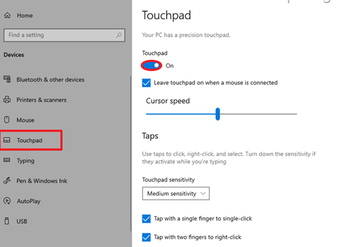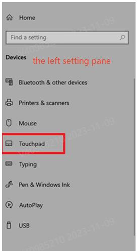 3. Now press the Tab key repeatedly until you go to the left setting pane and then using the DOWN arrow key navigate to Touchpad and hit Enter.