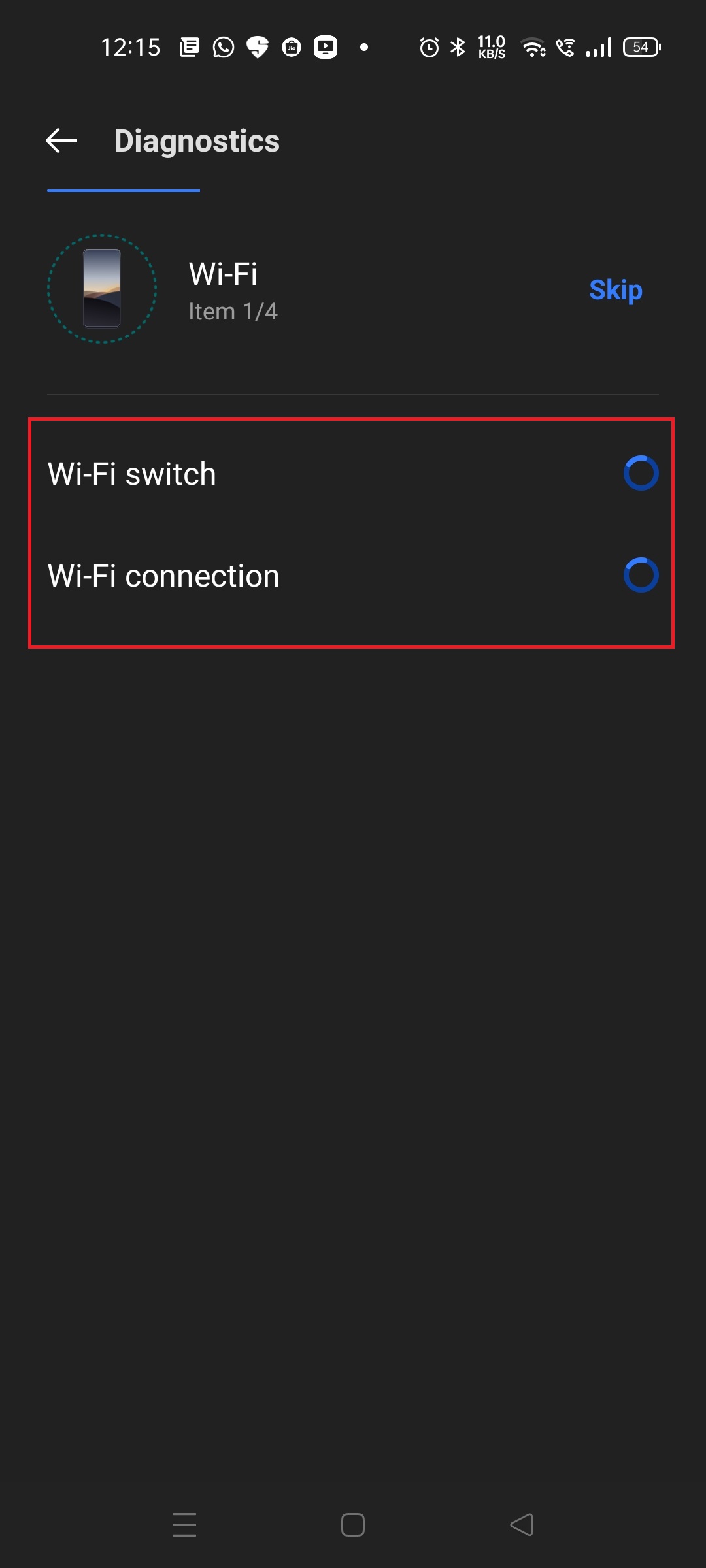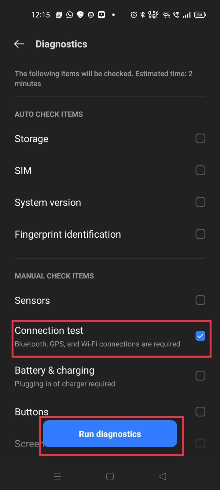 For realme UI 7.0 & 6.0 & 5.0: Phone manager > Click on the three dots at Right Top > Diagnostics > Select Connection test > Click Run Diagnostics to perform test > Check result.