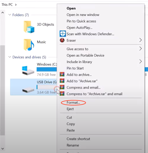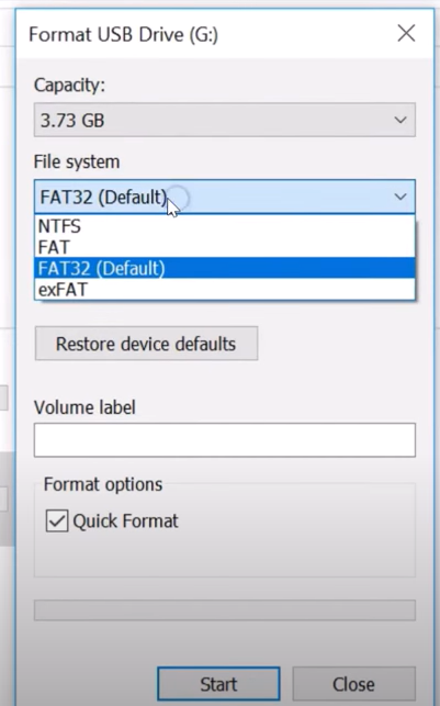 4. Select FAT32 or other options in the “File system” line and then choose “Quick format”.