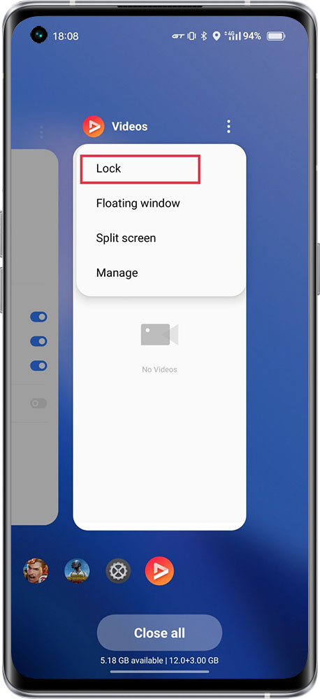 realme UI 2.0: Swipe up from the bottom of the phone > Recent task > Click the two points in the upper right corner of the app menu > Lock.