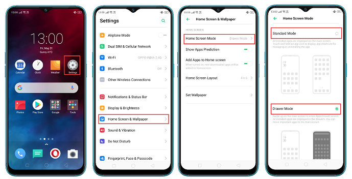 Swipe up on the main screen to enter the Apps Drawer screen. All installed apps are displayed in the drawers. You can move important apps to the main screen.