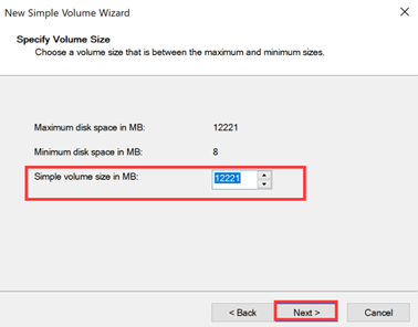 7. Enter the volume size you want to create in Simple volume size in MB and click Next.