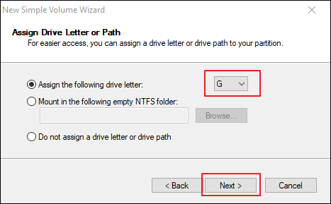 Step 7. Accept the default drive letter or choose a different letter for the partition, and then select "Next".