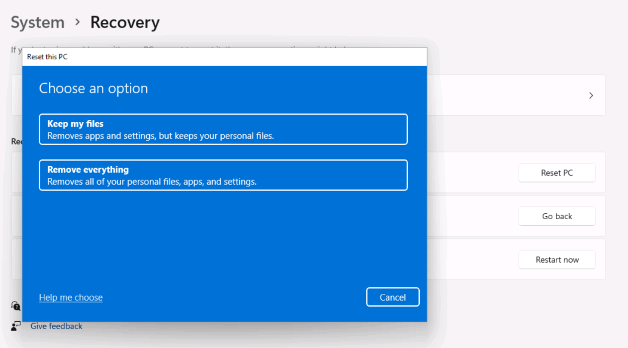 Select Remove everything (deletes all personal files, apps, and settings).