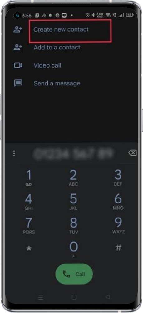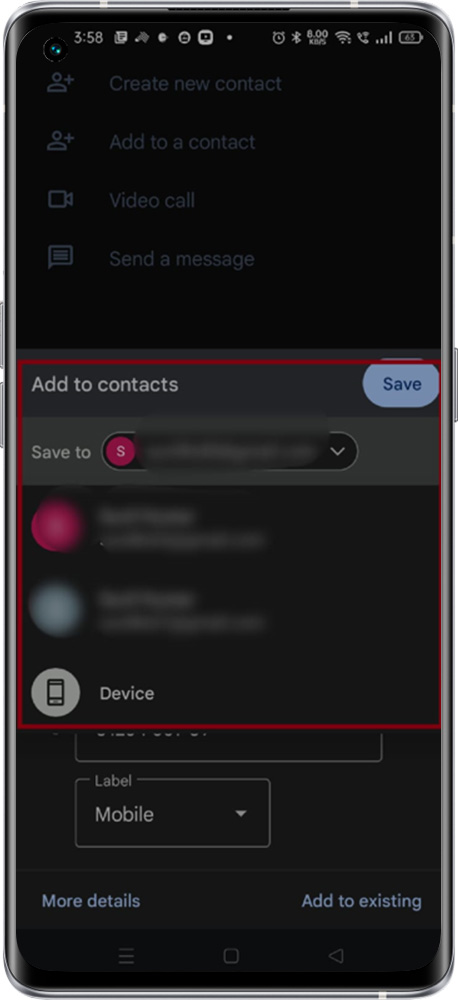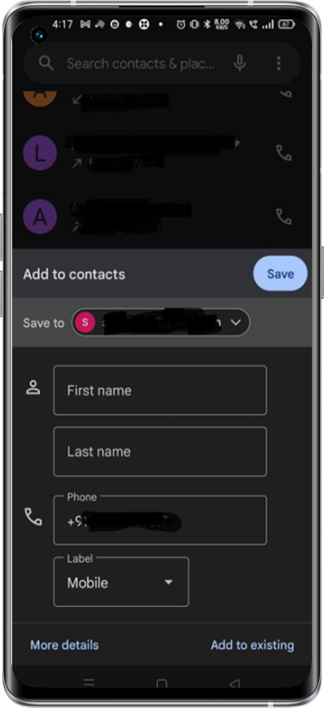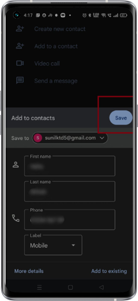 1. Open the Phone app > Type the contact number > Click on Create New Contact > Click "Save to" where you want to save the contact detail (Gmail ID or Phone Memory) > Type the First and last name of the contact and Select the Label as per the nature of the contact > Click on the Save