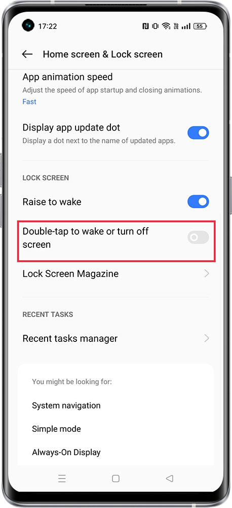 realme UI 2.0: Settings > Home screen, Lock screen & Always-On Display > Double tap to turn screen on
