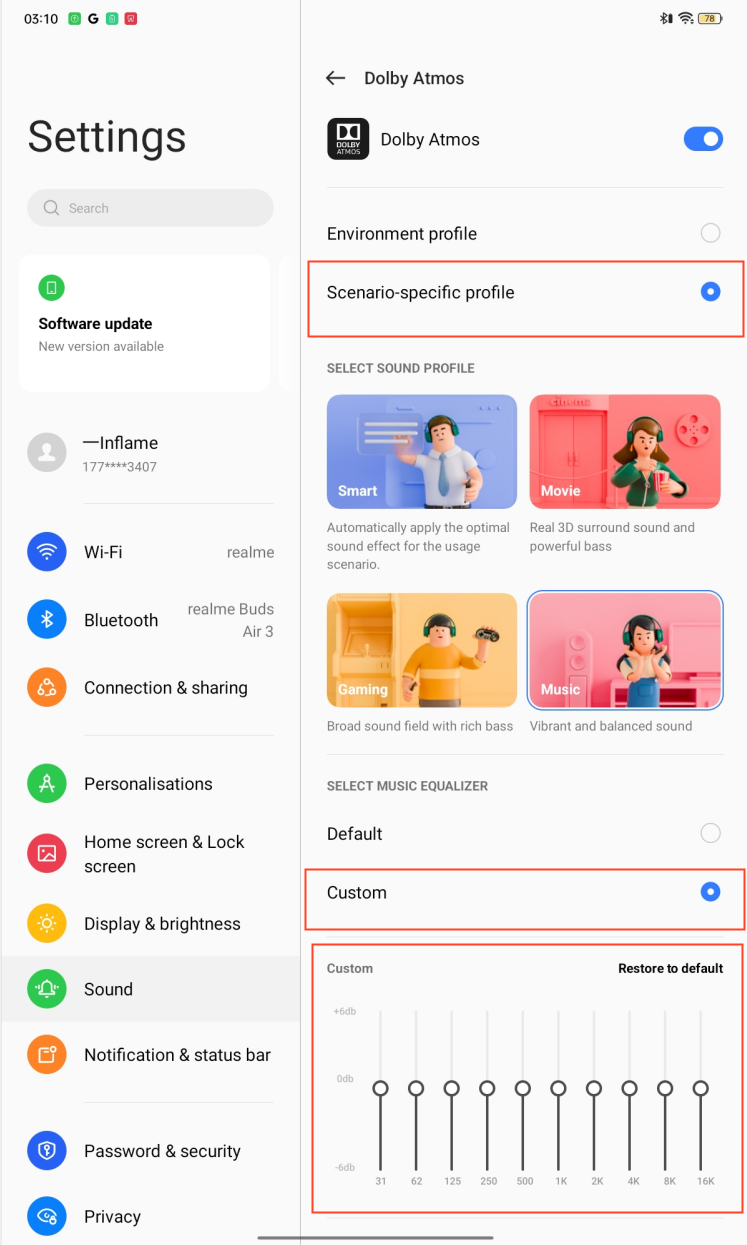 realme UI 3.0 & above versions: Settings > Sound & Vibration > Dolby Atmos > Scenario-specific profile > Select Music > Select Custom > You can manually adjust the music effect.