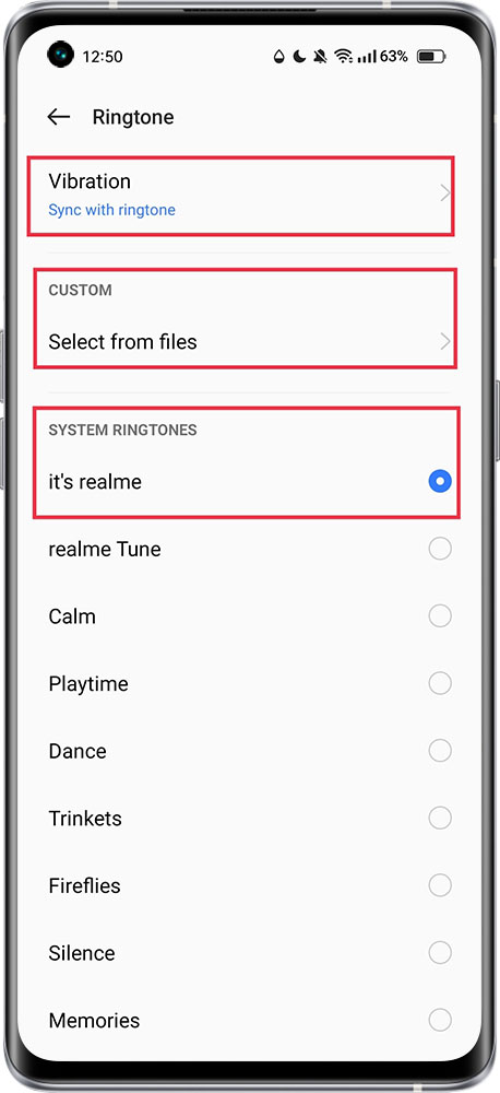 realme UI 1.0 and above versions: Settings > Sound & vibration > Ringtone, Notification sound > Choose Custom or System Ringtones.