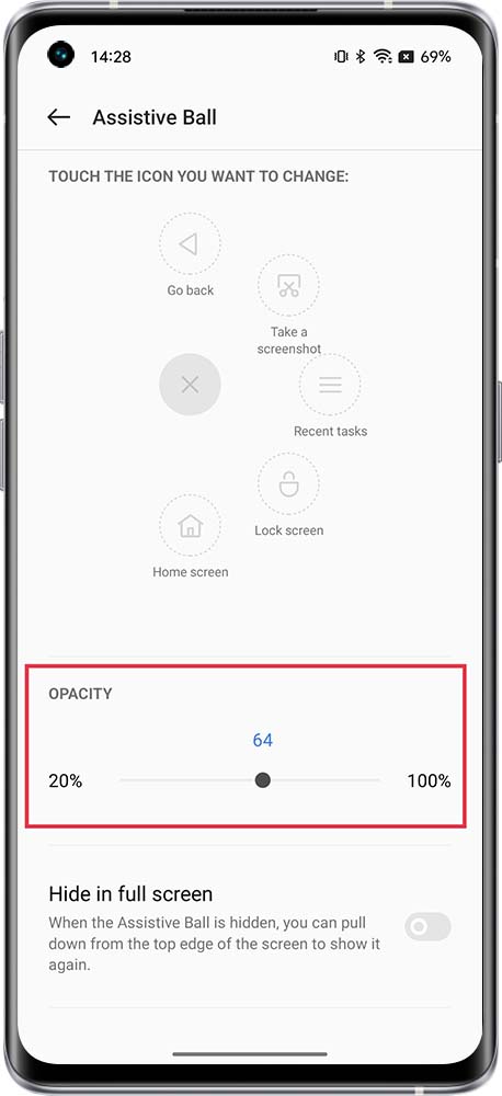 realme UI 7.0: Settings > Accessibility & convenience > Assistive Ball > Opacity