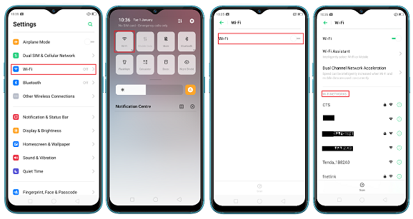 Swipe down notification bar--> Long press the Wi-Fi icon-->Turn on the Wi-Fi switch-->Click on a network under the ‘Wi-Fi NETWORKS’