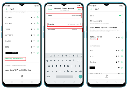 Click on“ Manually add a network” under the “Wi-Fi NETWORKS”-->Enter the Wi-Fi name security type and password-->Click to join.