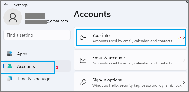 Step 2: Click Accounts, and then click Your info.