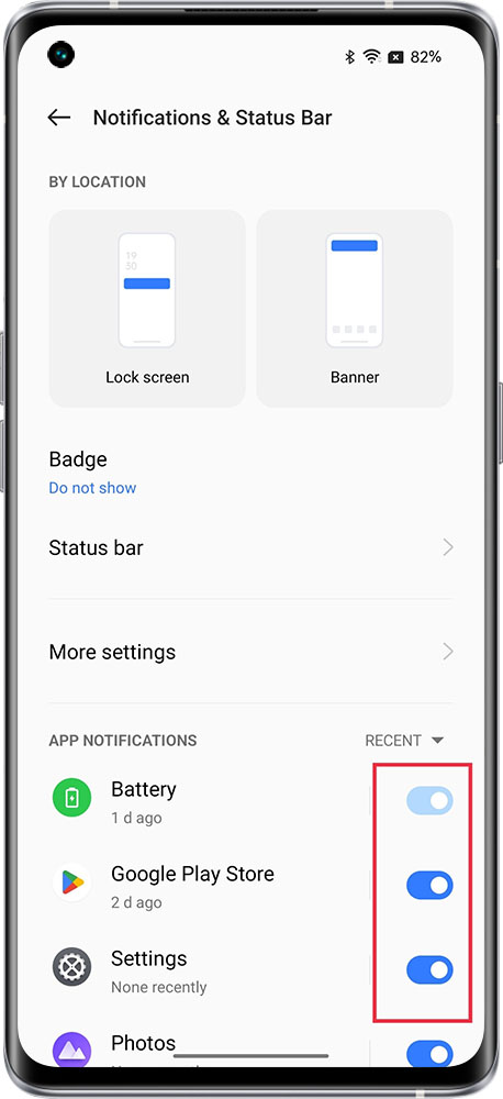realme UI 2.0 & 1.0: Settings > Notification & status bar > Manage notifications > Select Apps > Turn off the notifications