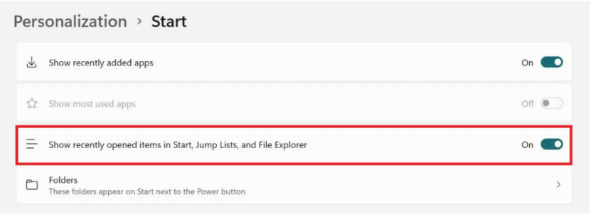 3. Turn off the "Show recently opened items in Start, Jump Lists, and File Explorer".