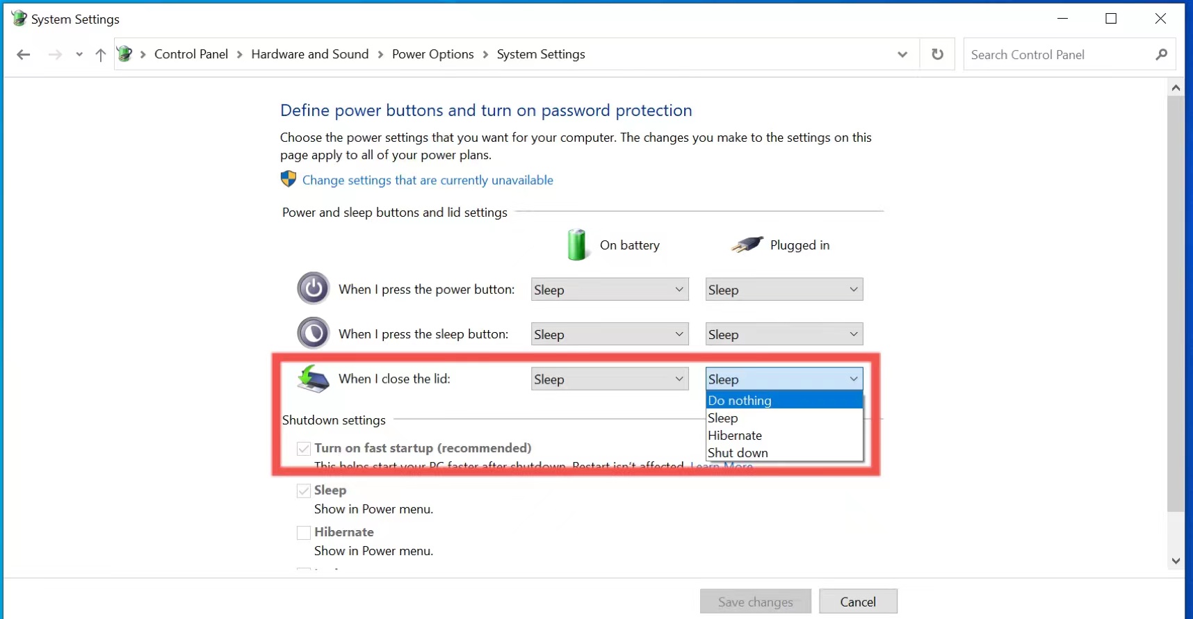3.When I close the lid: select “Do nothing”.