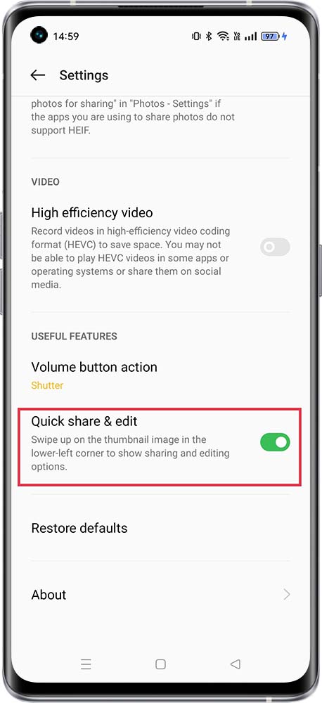 Quick share & edit setting method: Camera > More icons in the upper right corner > Settings > Quick share & edit