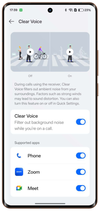 This feature enhances the calling experience by reducing environmental sound while calling.