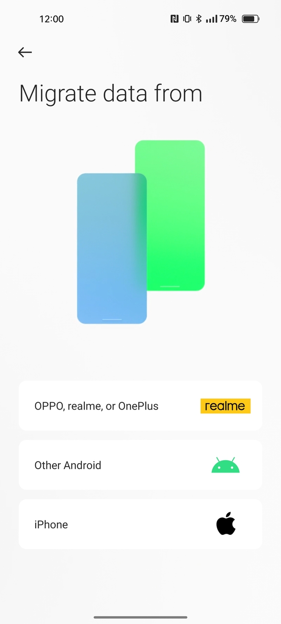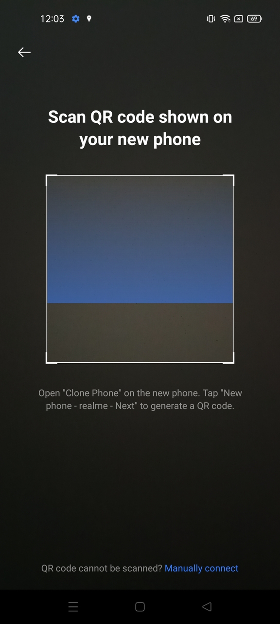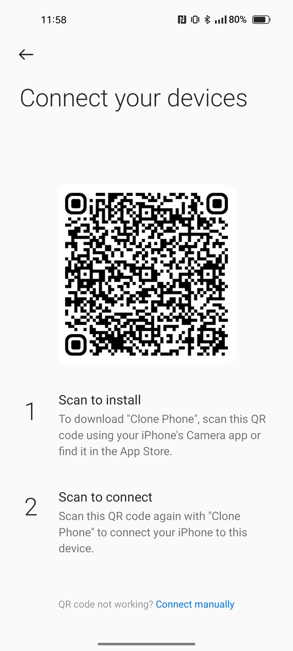 3. If the old phone is not a realme phone, please use the browser of the old phone to scan the QR code on the new phone to install the Clone Phone (if the old phone is a realme phone, ignore this step and go directly to step 4). After the old phone scans the code, click Next on the new phone to wait for the old phone to scan.