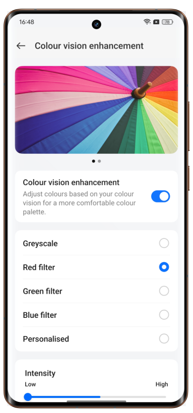 After turning on the color vision enhancement function, you can choose from grayscale, red filter, green filter, blue filter, and personalized color vision enhancement. You can adjust the strength of each enhancement effect by sliding the adjustment bar.