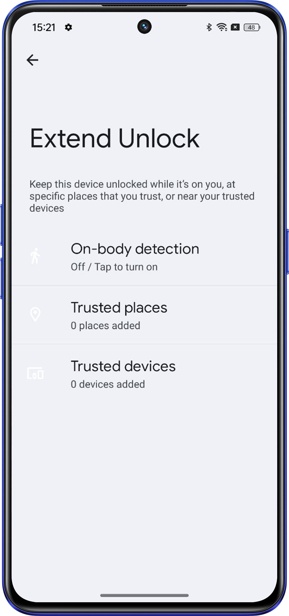 Extend unlock is the new name of Smart lock feature provided by Google Android. Extend Unlock keeps this device unlocked when it's with you.
