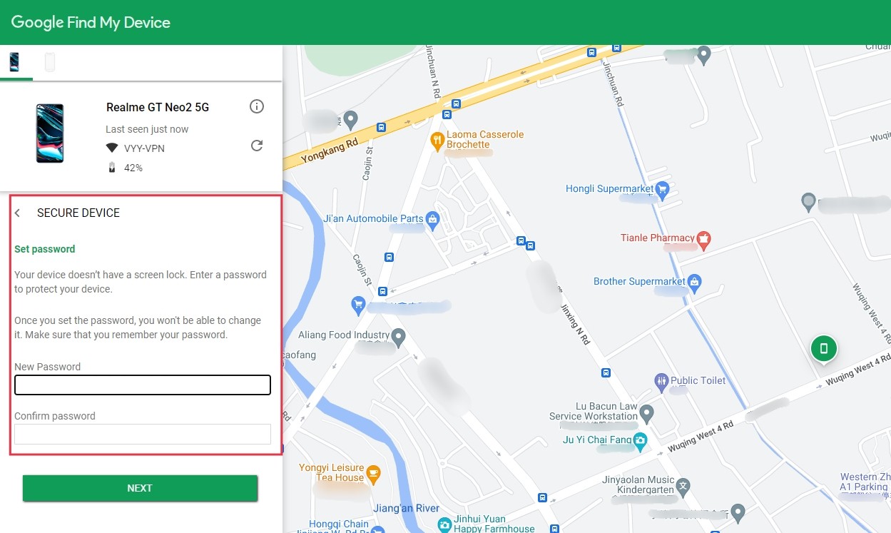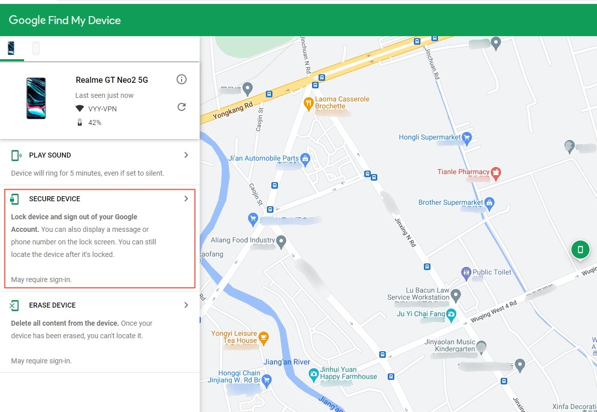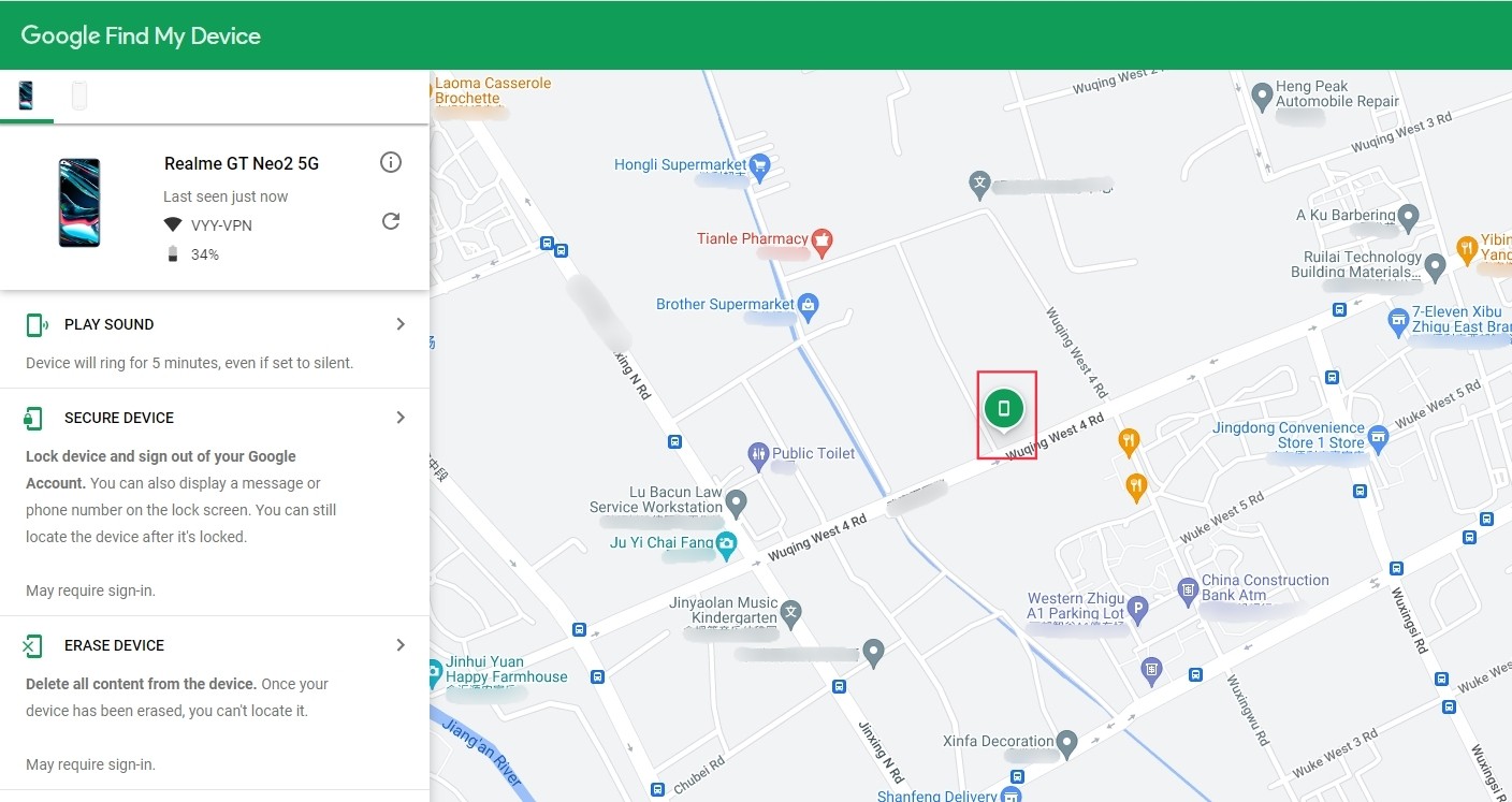 Select the device you want to locate on the Find My Device screen. On the map, you'll get info about where the phone is.
