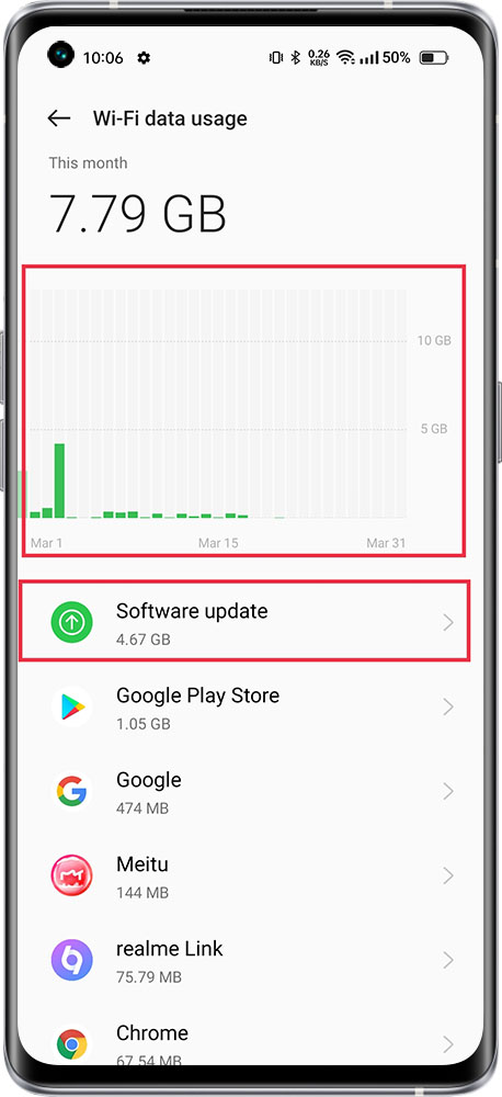 realme UIs: Settings > Search "Wi-Fi data usage" in the search bar > Wi-Fi data usage
