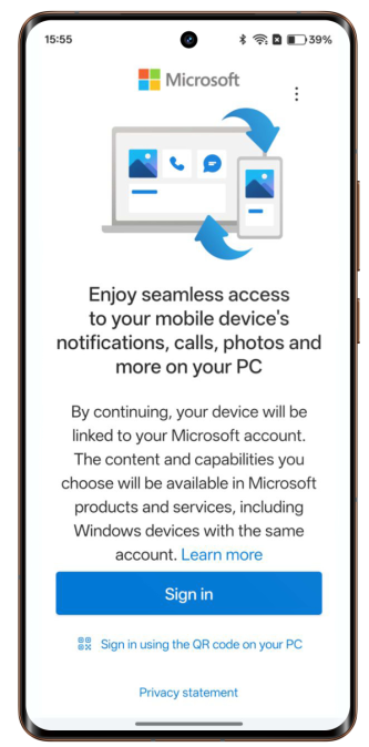 2. When using it for the first time, click on the mobile phone to connect the mobile device and the computer, use the browser to visit https://pair.phonelink.microsoft.com/ on the Windows computer, and follow the interface prompts to open the QR code. Click Continue on your phone, then use your phone to scan the QR code on the computer screen to log in and connect. Follow the prompts to set permissions to complete the connection.