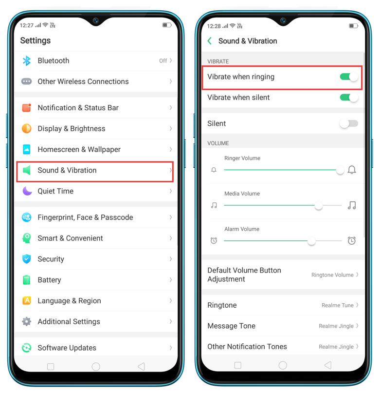 realme UI R & Go Edition: Settings > Sound > Vibrate for calls > Always vibrate.