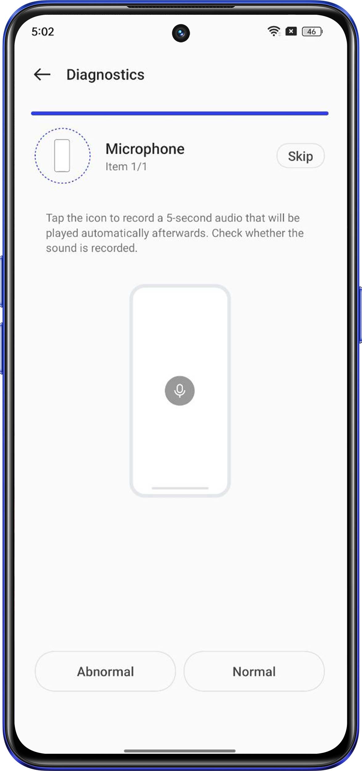 For realme UI 2.0: Go to Phone Manager > Diagnostics > Continue > Select Audio > Run Diagnostics and follow the instructions to perform the test.