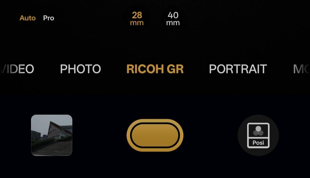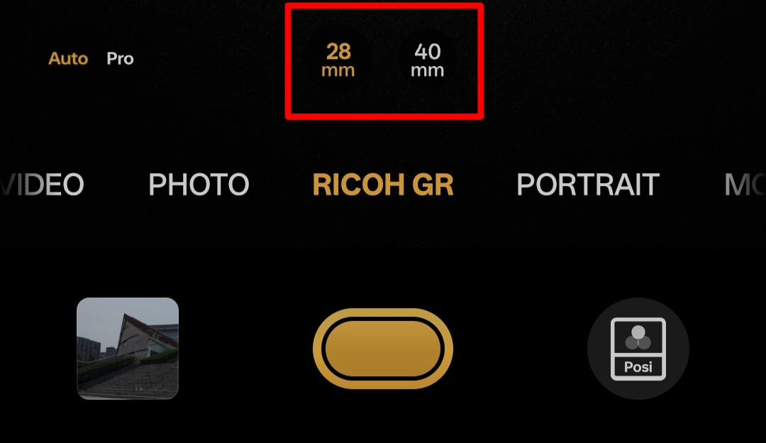 The Ricoh GR mode features a fixed 28mm/40mm dual focal length. Simply tap the focal length value on the screen to quickly switch between them, adapting to different scene composition needs.