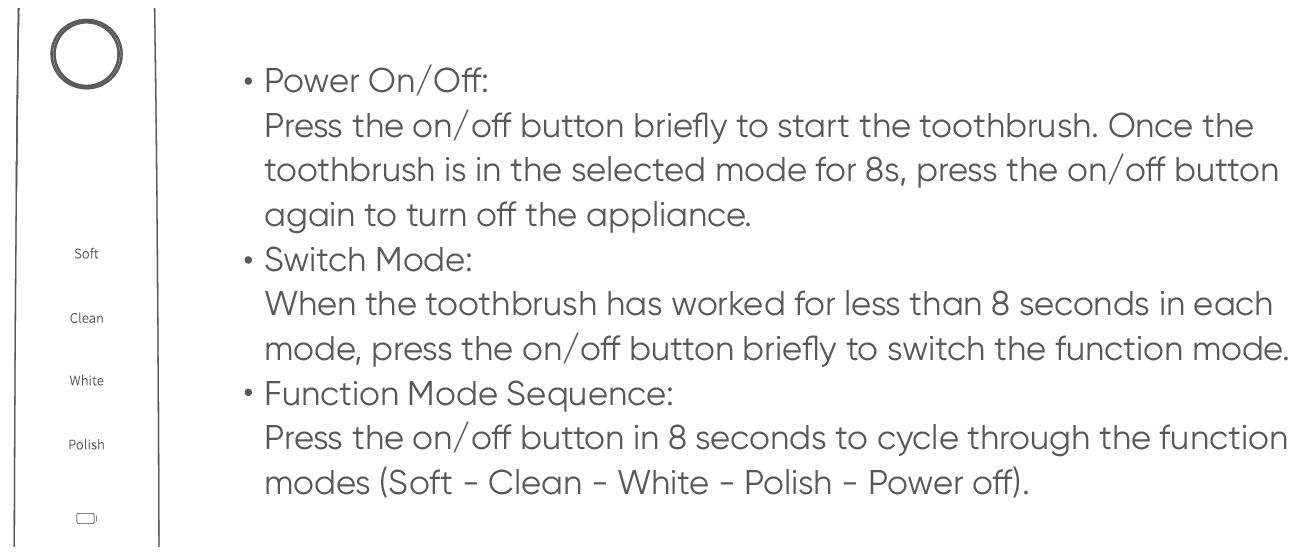 Once the toothbrush is powered on, it will work in the selected mode for more than 8 seconds. Press the on/off button briefly to power off the toothbrush. The next time you use the toothbrush, it will automatically return to the last function mode you used before it was powered off.