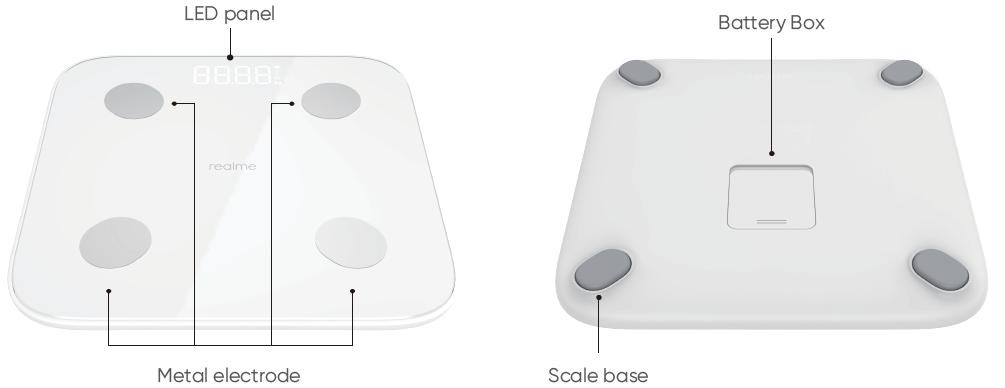 Package Contents | Southeast Asia(without ID) Version:realme smart scale*1,AAA Batteries*4,Operating manual & warranty card; West Europe & ID:realme smart scale*1, Operating manual & warranty card |