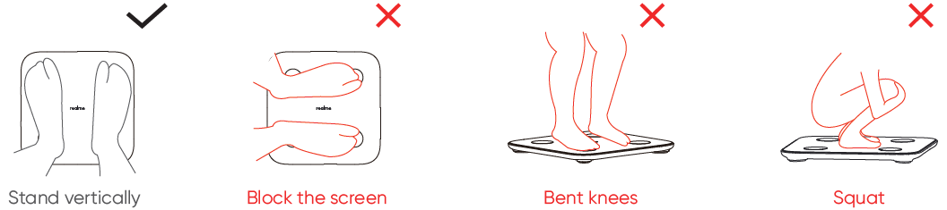 Note: In order to guarantee data accuracy, you are suggested to adopt a correct standing posture barefooted for the measurement.