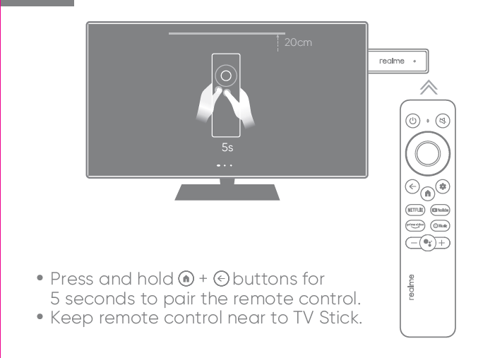 6. Please press and hold the home and ⇠ buttons for 5 seconds. Please repeat the operation several times and keep the remote control close to the TV stick, no more than 20 cm.